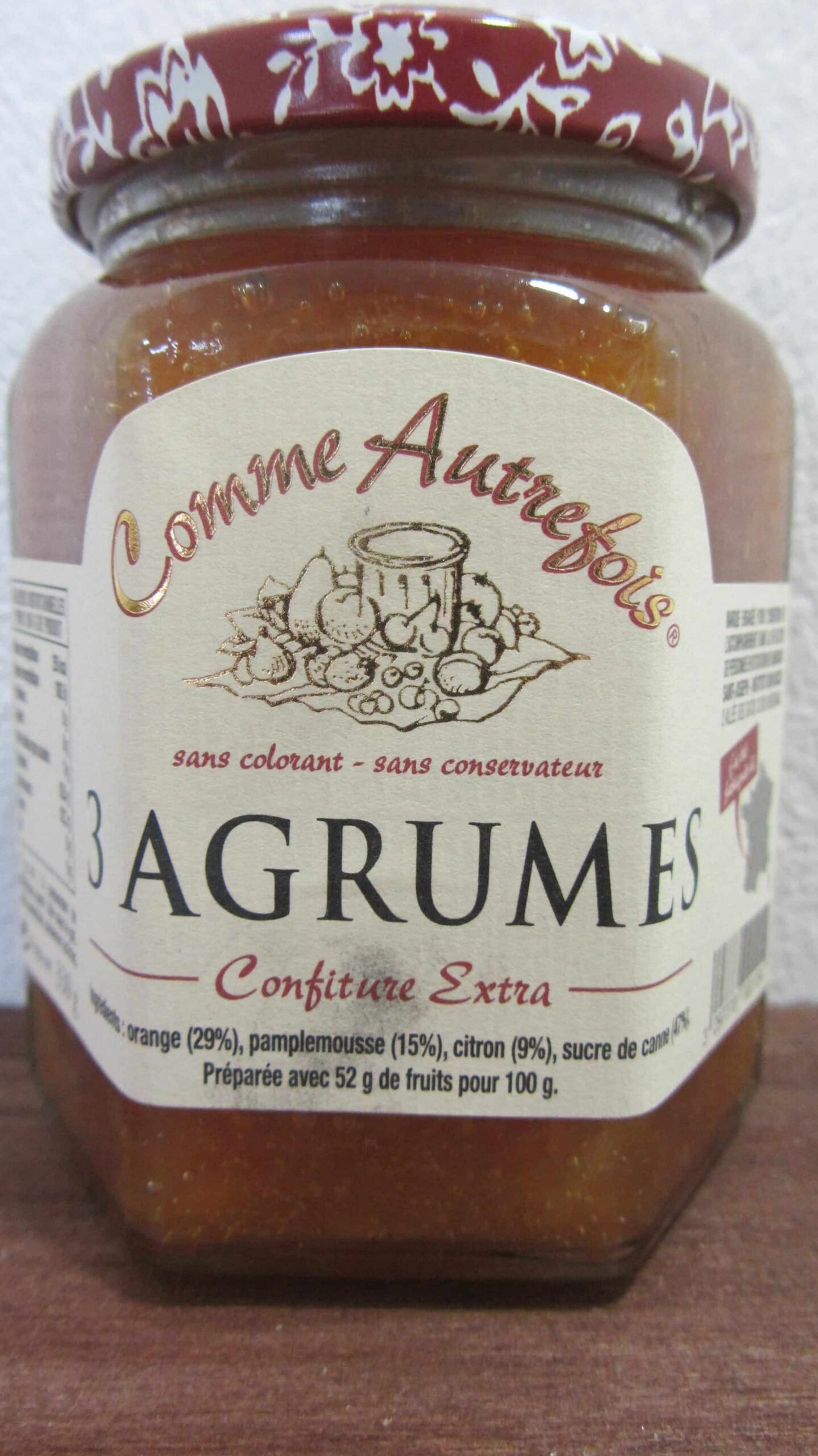 Ingrédients: Orange ( 29%), Pamplemousse (15%), citron (9%), sucre de canne (4,70%).