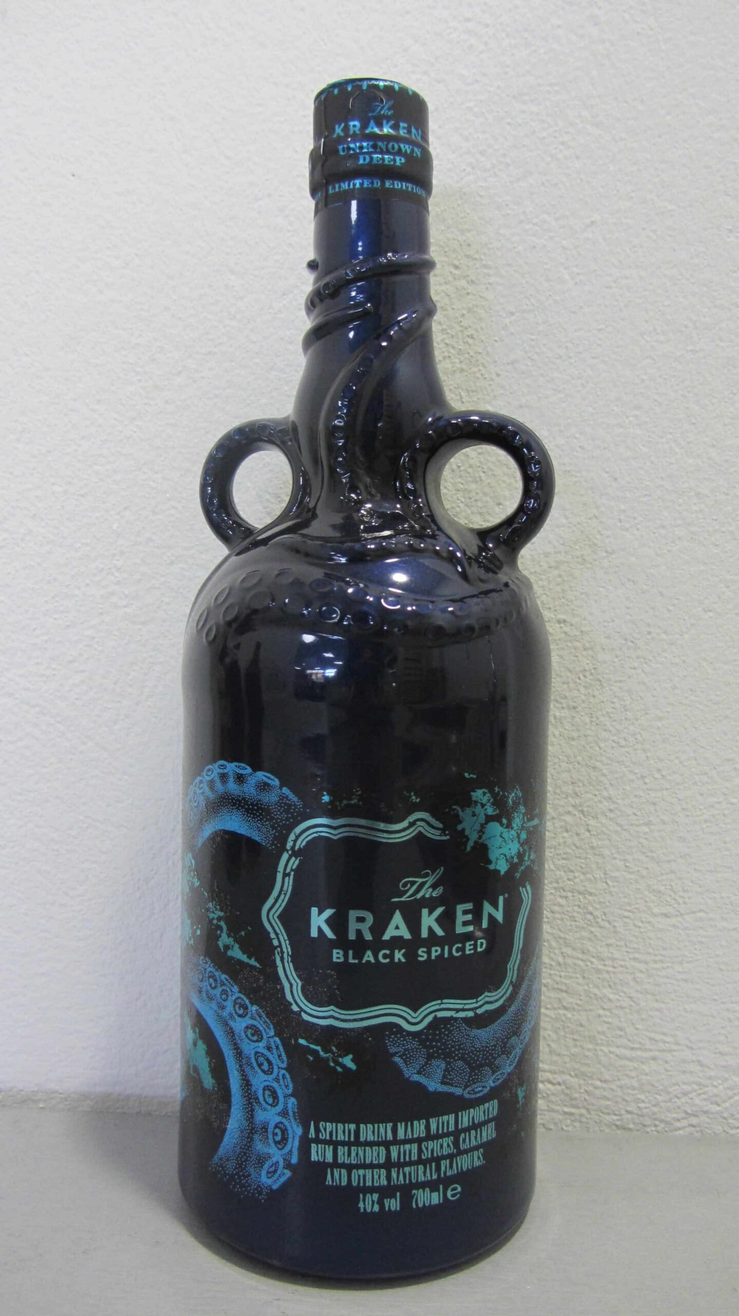 Admirez cette bouteille Collector : du fond de l’obscurité la plus noire, quelques tentacules apparaissent dans une lumière bleutée, révélant le monstre tapi dans l’ombre : le terrible Kraken !